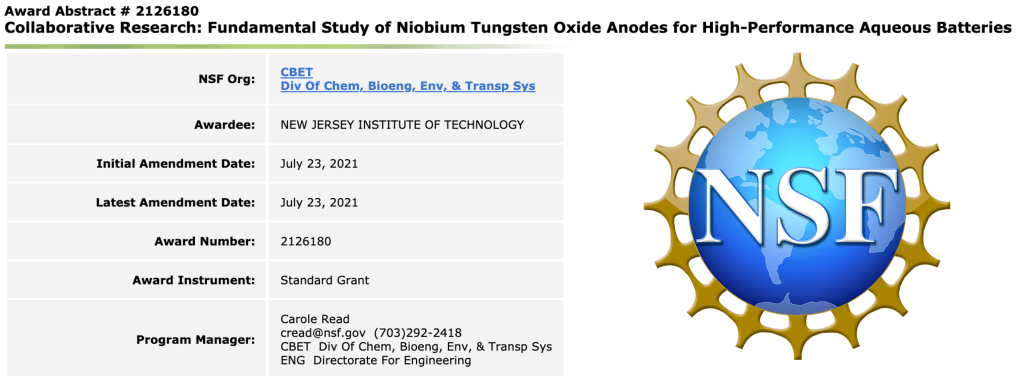 We received an NSF grant from CBET Electrochemical System program. Collaborative Research: Fundamental Study of Niobium Tungsten Oxide Anodes for High-Performance Aqueous Batteries