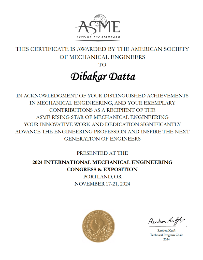 American Society of Mechanical Engineering (ASME) honored Dibakar Datta with the ASME Rising Star 2024 Award [Abstract]
