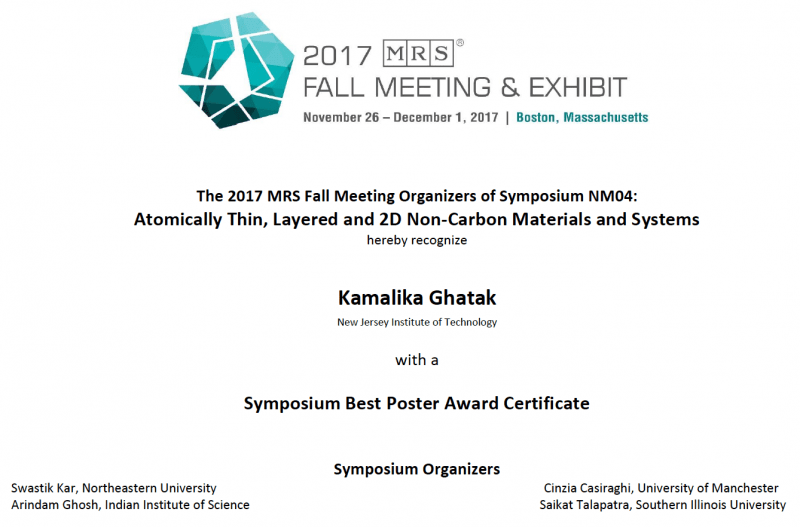 2017 : Postdoc Dr. Kamalika Ghatak won the Best Poster Award for her poster on TMD at MRS Fall 2017 Meeting.