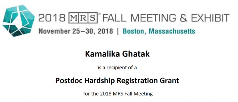 2018 : Postdoc Dr. Kamalika Ghatak won the ‘Postdoc Hardship Registration Grant’ to attend the 2018 MRS Fall Meeting, Boston, USA, Nov 25-30, 2018.