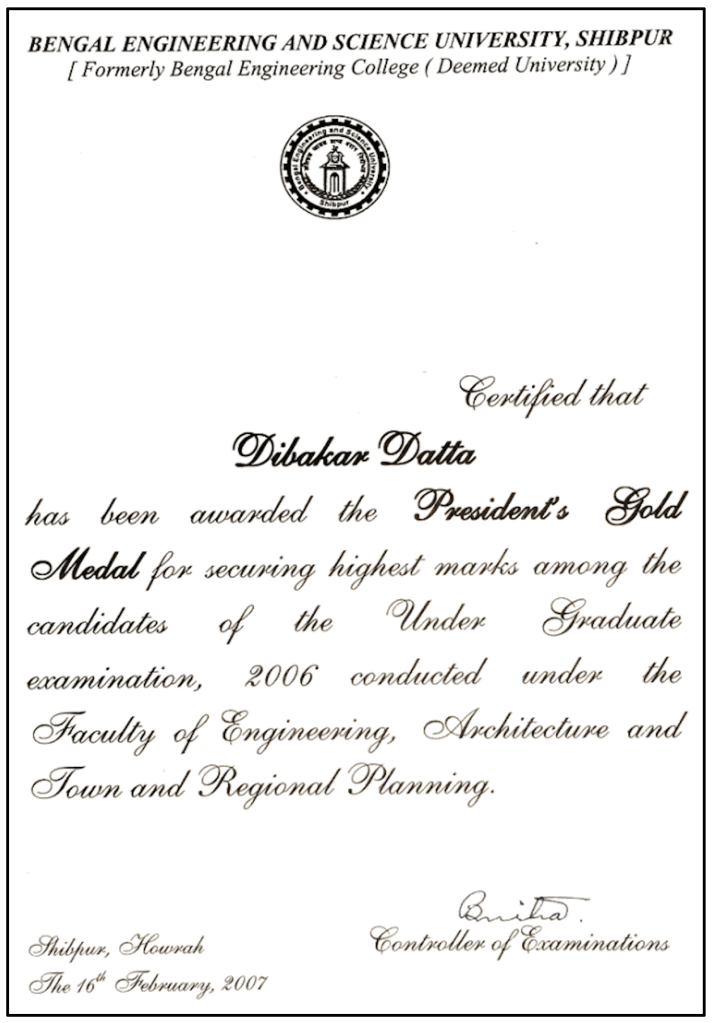 from His Excellency Shri. Gopal Krishna Gandhi (grandson of Mahatma Gandhi), Governor of the state West Bengal for securing the first rank among all the undergraduate students (Batch-2006) in all departments in the university (out of 500+ students).