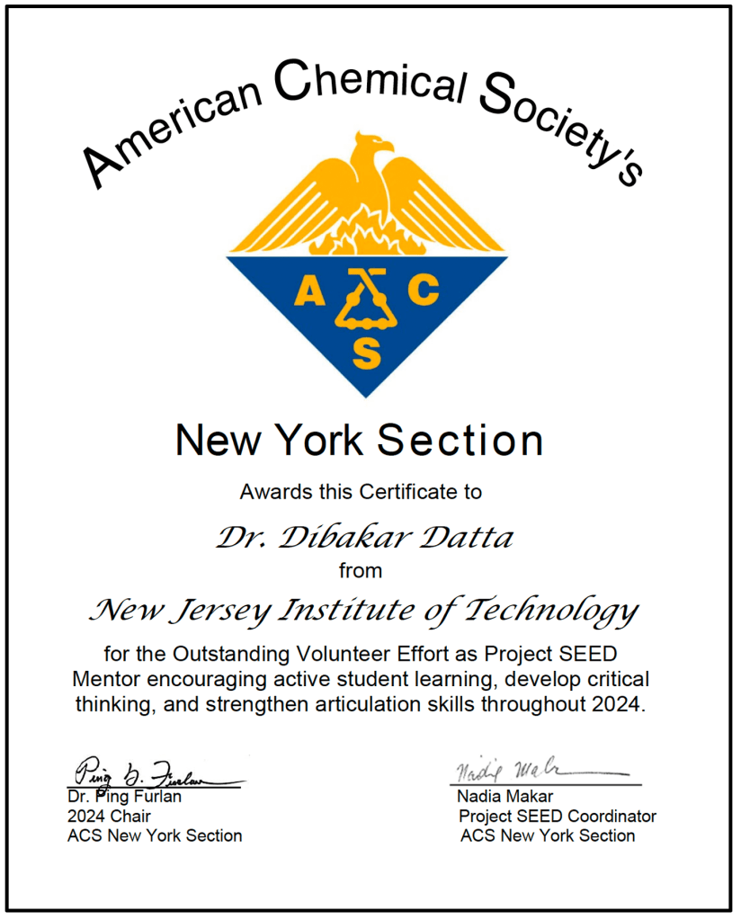 2024 : American Chemical Society (ACS) recognized Dibakar Datta for peer reviewing activities.