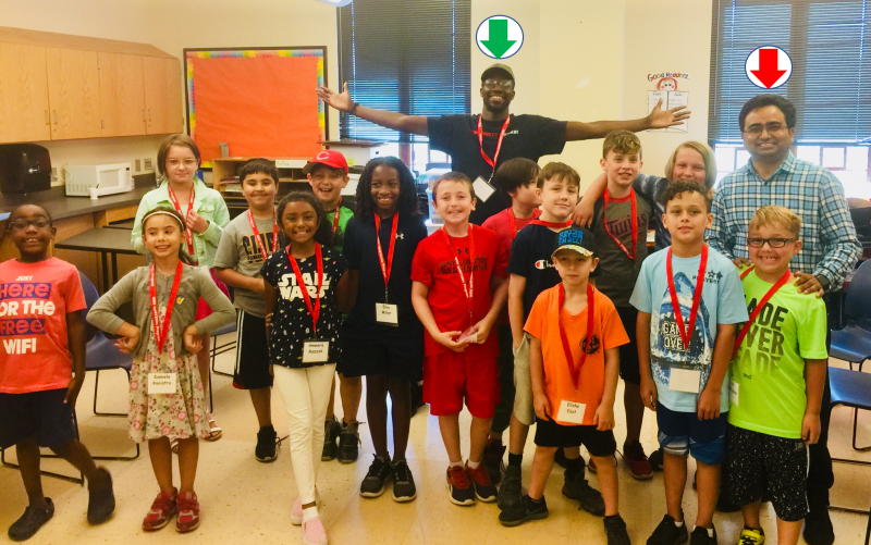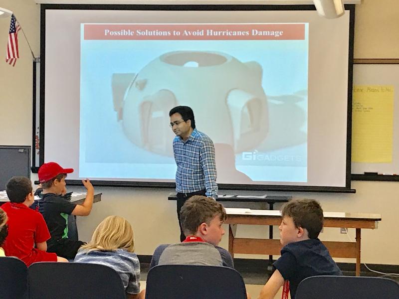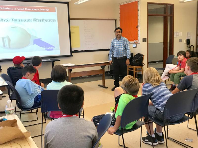 Dr. Datta (marked in red arrow) worked with the pre-college teacher (marked in green arrow) at the Montclair State University, Montclair, NJ. Dr. Datta taught students of grade 2-3 and 4-8. He introduced the design cycle to solve problems, how engineering work depends on teamwork, and using engineering to solve problems in everyday life with specific examples pertaining to surviving hurricane winds, flooding, and extreme temperatures.