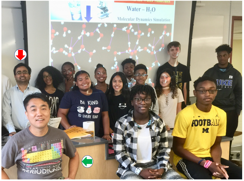 Dr. Datta (red arrow) worked with the pre-college teacher Dr. Nick Lee (green arrow). Datta taught high school students of grade 9 and 10 about Molecular Dynamics simulation. NJIT Pre-College Program organized this high-school summer program.